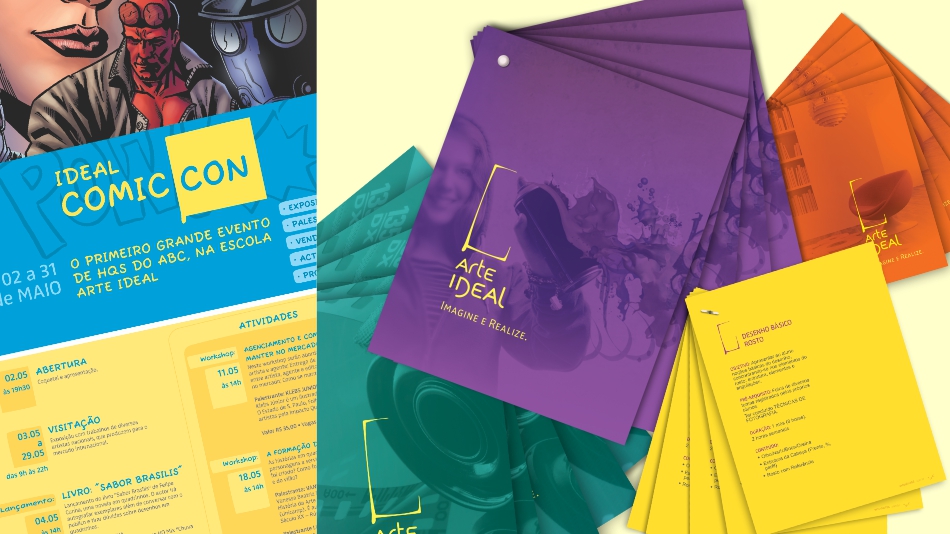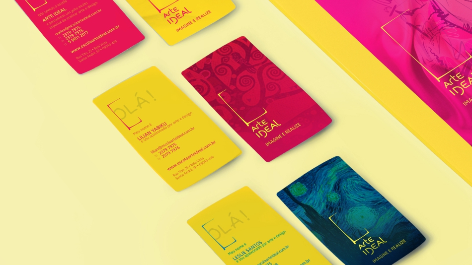 Criamos um logo mutante que permite desdobramentos de cor e forma, traduzindo assim o método de ensino da escola Arte Ideal, mais dinâmico, livre e prazeroso.